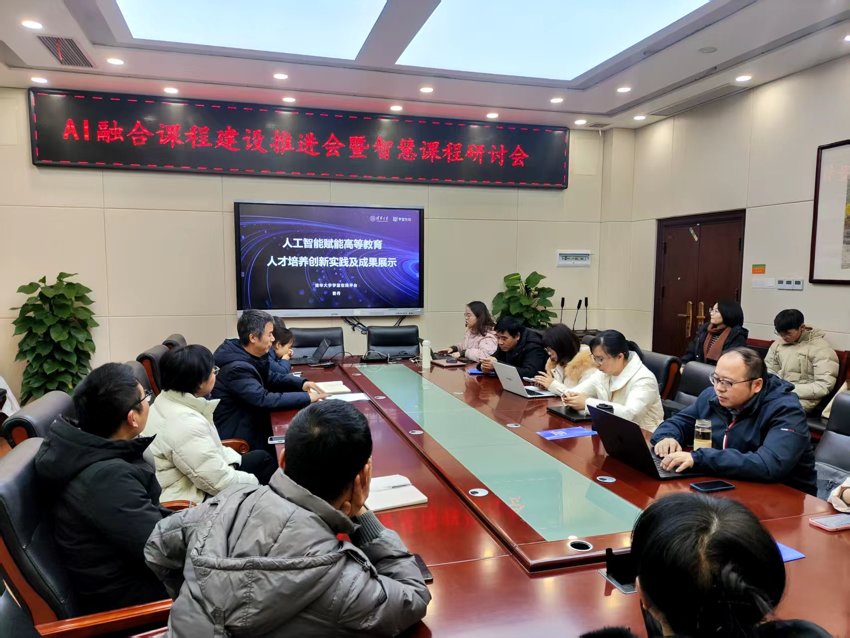 (通讯员 沈坤)1月21日上午,我院在中和楼338会议室召开AI融合课程建设推进会暨智慧课程研讨会。会议由学院常务副院长张连明教授主持,并邀请学堂在线的技术专家介绍智慧课程建设实践及案例。张连明教授首先介绍了我院AI融合课程校级立项的情况,以及学校对AI融合课程建设的期望与要求,并分别了解已立项课程的建设现状。随后,学堂在线的技术专家以“人工智能赋能高等教育人才培养创新实践及成果展示”为题,详细介绍了学堂在线AI课程建设的解决方案,并展示了已建设的AI融合课程案例。最后,与会老师就各自关心的问题进行了交流与讨论。